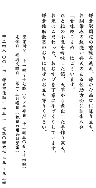 はじめに こまめ黒かんができるまで ,http://gdata.youtube.com/feeds/api/videos/9Ycq1Iz2Yj8,,{"playerWidth":"480","useCustom":false,"autoPlay":false,"autoLoop":false,"autoNext":false,"quality":"default","qualityName":"自動","coverImage":""} お電話でのお問合わせ0467-23-8334 営業時間平日 11:00 - 17:00 (ランチ平日 11:30~14:00) 定休日毎週火曜日・第三月曜日